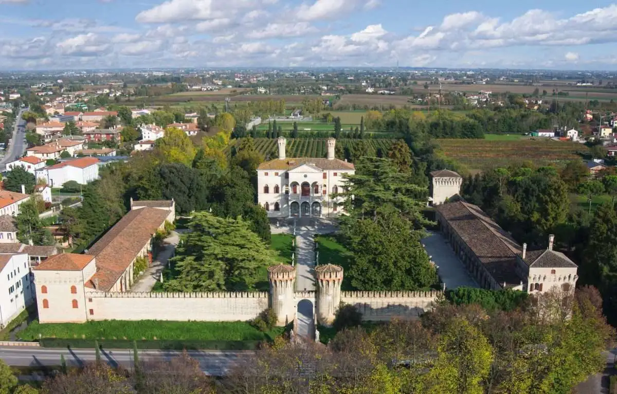 La villa cinquecentesca è incorniciata da due maestose barchesse porticate e da mura alte sette metri coronate da una merlatura a coda di rondine.
